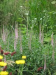 Ook de donkerbladige Zilverkaars Cimicifuga ramosa ‘Atropurpurea’ leek mij prachtig te staan bij Molinia, Stipa en Echinacea. Ik had nochthans beter kunnen weten, want jaren eerder al had ik een groenbladige Zilverkaars van de nipte dood gered door hem naar een schaduwplek te verhuizen, waar hij nu overigens nog welig tiert. De donkerbladige Zilverkaars houdt ik momenteel met kunst en vliegwerk overeind, maar het blijft een triestige bedoening. Hij komt niet eens boven de Stipa en Echinacea uit, dus veel plezier van die zogedacht mooie combinatie heb ik er niet van.